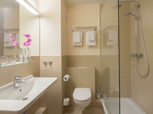 Dusche, WC, Handtücher, Haartrockner, Spiegel,