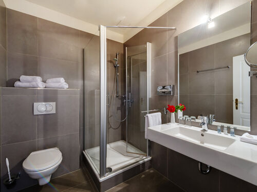 Dusche, Badewanne, WC, Handtücher, Spiegel, Kosmetikspiegel,