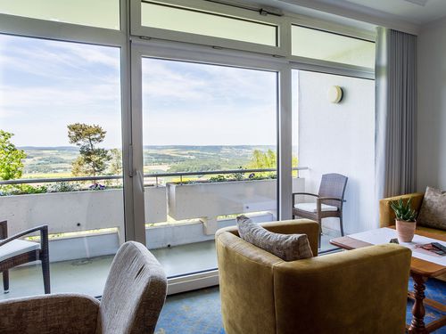 Genießen Sie den grandiosen Ausblick ins Kulmbacher Land hoch über dem Luftkurort Wirsberg auf unserer Terrasse mit Panoramablick und genießen Sie die wildromantische Landschaft im Hotelgarten, bei einer Wanderung oder einem Spaziergang.