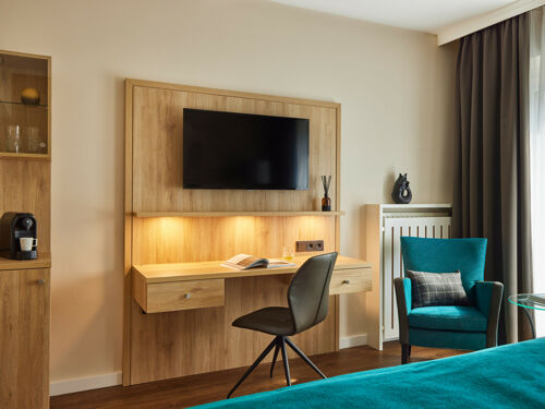 Sessel, Schreibtisch, Zimmersafe, Ganzkörperspiegel, Kaffee-/Teezubereiter,