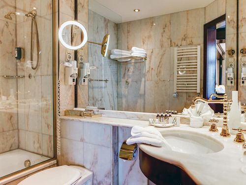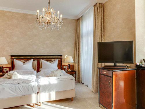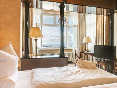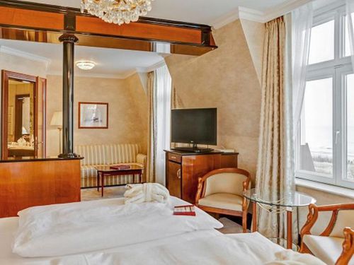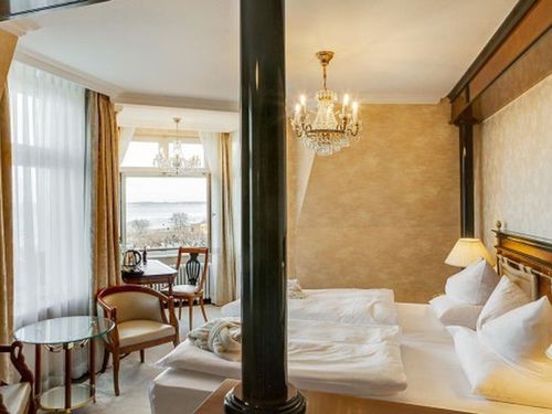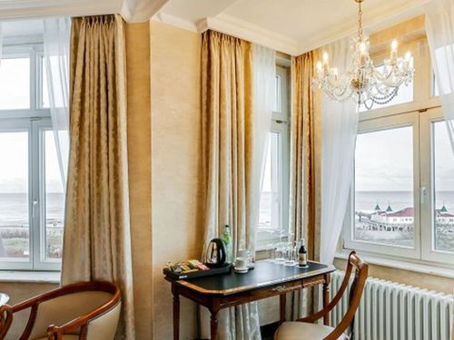 Hinter der klassischen Fassade im Stil der Bäderarchitektur verbirgt sich eine gelungene Symbiose aus nostalgischer Gemütlichkeit und luxuriösem Komfort. Edle Hölzer, elegante Stoffe, glitzernde Kronleuchter und schimmernder Marmor werden Sie verzaubern.