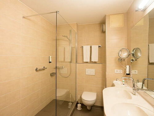 Dusche, Badewanne, WC, Handtücher, Spiegel, Kosmetikspiegel,