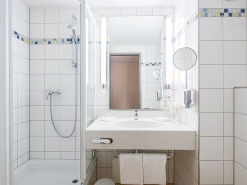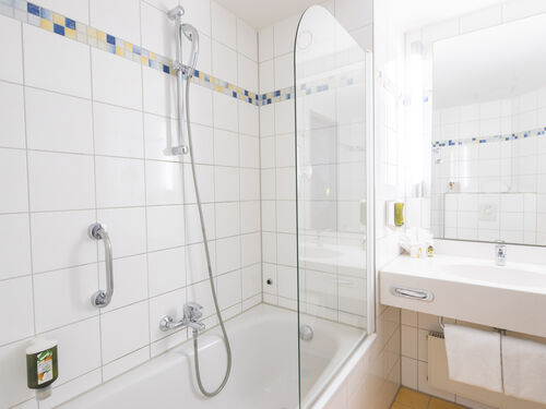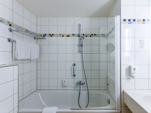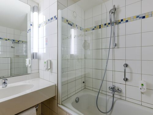 Dusche, Badewanne, WC, Handtücher, Haartrockner, Spiegel, Kosmetikspiegel,