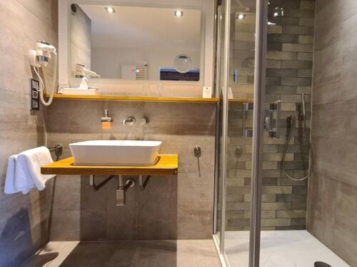Dusche, Badewanne, WC, Handtücher, Spiegel,