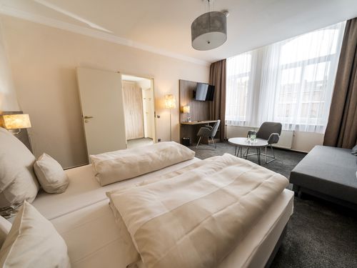 Aufbettung möglich, Babybett zustellbar, getrennte Betten, Sessel, Tisch + Stühle, Schreibtisch, Ganzkörperspiegel, Sitzecke,