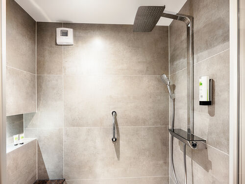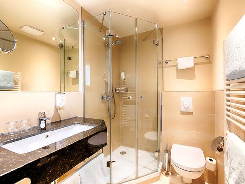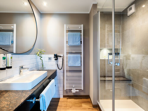 Dusche, WC, Handtücher, Haartrockner, Spiegel, Kosmetikspiegel, Handtuchtrockner, Bademantel,