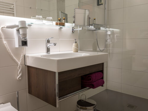 Dusche, WC, Handtücher, Haartrockner, Spiegel, Kosmetikspiegel, Handtuchtrockner, Kosmetik- und Pflegeprodukte,