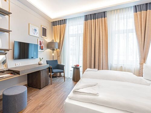 Aufbettung möglich, getrennte Betten, Sessel, Tisch + Stühle, Schreibtisch, Zimmersafe, Ganzkörperspiegel,