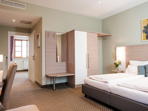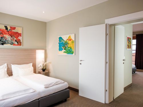 Telefon, Klimaanlage, Lärmschutzfenster, separate Kofferablage, Zimmer mit Verbindungstür, getr. Wohn/Schlafbereich, Nichtraucherzimmer, W-LAN (kostenfrei), TV inkl. Radio,
