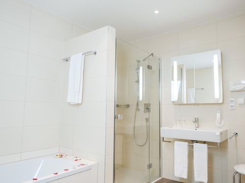 Dusche, Badewanne, WC, Handtücher, Spiegel, Kosmetikspiegel,