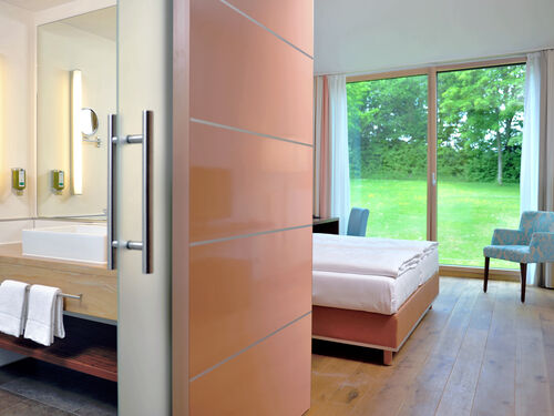 Im Hotel FREIgeist erwartet Sie eine Atmosphäre, wie Sie sie kaum in einem anderen Hotel finden. Inmitten der Natur lassen Sie den Alltag hinter sich. Entspannen Sie in der natürlichen Umgebung des Waldes und genießen Sie die herrliche Ruhe vor Ort. Hohe Fenster lassen die Räume von natürlichem Licht durchfluten und spenden ein natürliches Ambiente.
