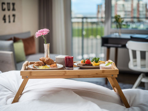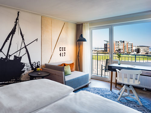 In einer der faszinierendsten Lagen Cuxhavens, direkt am Seedeich gelegen, nur den sprichwörtlichen Steinwurf vom Weltschifffahrtsweg entfernt, findest Du unser Hotel. Von vielen der komfortablen Zimmer sowie vom höchsten Panorama-Restaurant Cuxhavens "DONNERS Wein & Küchenbar" und vom Frühstücksraum in der 6. Etage hast Du einen spannenden und ebenso entspannenden Blick auf die Hafenanlagen und die Elbmündung.