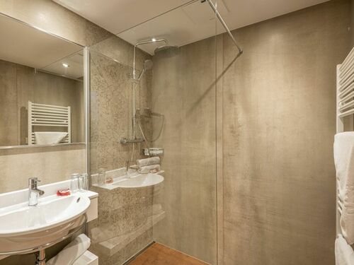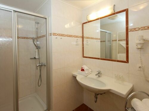 Dusche, Badewanne, WC, Handtücher, Spiegel, Handtuchtrockner,