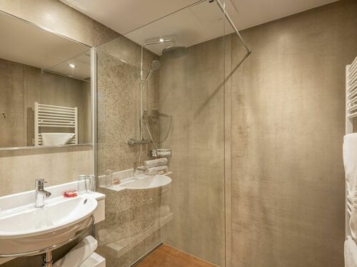 Dusche, WC, Handtücher, Spiegel, Handtuchtrockner,