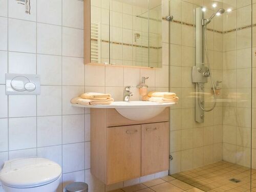 Dusche, WC, Handtücher, Spiegel, Handtuchtrockner,