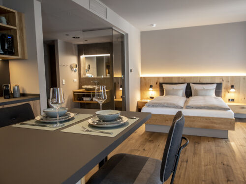 Aufbettung möglich, Anzahl Doppelbett/en, Babybett zustellbar, Couch, Tisch + Stühle, Schreibtisch, Zimmersafe, integrierte Kochnische, Kaffee-/Teezubereiter,