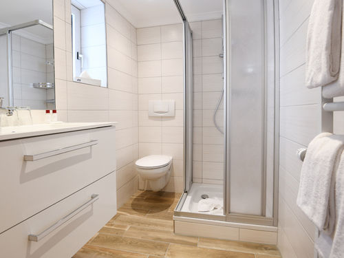 Dusche, WC, Handtücher, Haartrockner, Spiegel,
